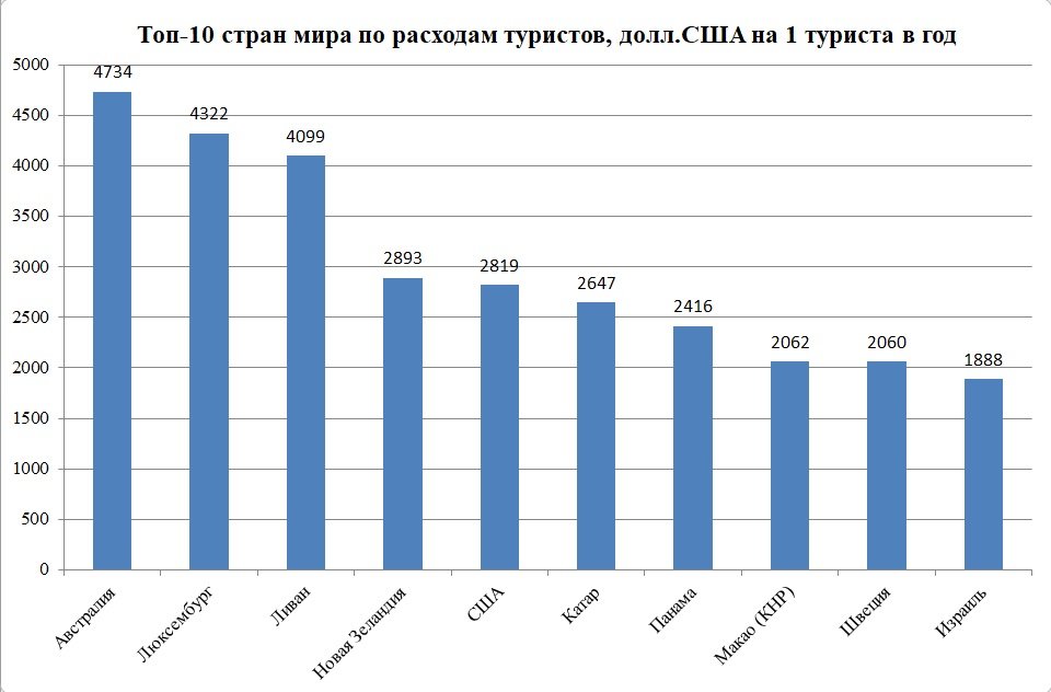 Из отчёта UNWTO становится понятен и рейтинг стран с наивысшими тратами в расчёте на одного туриста. Для этого просто нужно поделить общий объём расходов на количество зарубежных туристов. Atorus.ru опубликовал инфографику для наглядности. Лидеры в новом рейтинге изменились, появились новые страны. Первое место у Австралии, второе — Люксембург, третью позицию занимает Ливан, четвёртую — Новая Зеландия. Также лидерские позиции в топе сохранили США и Макао.